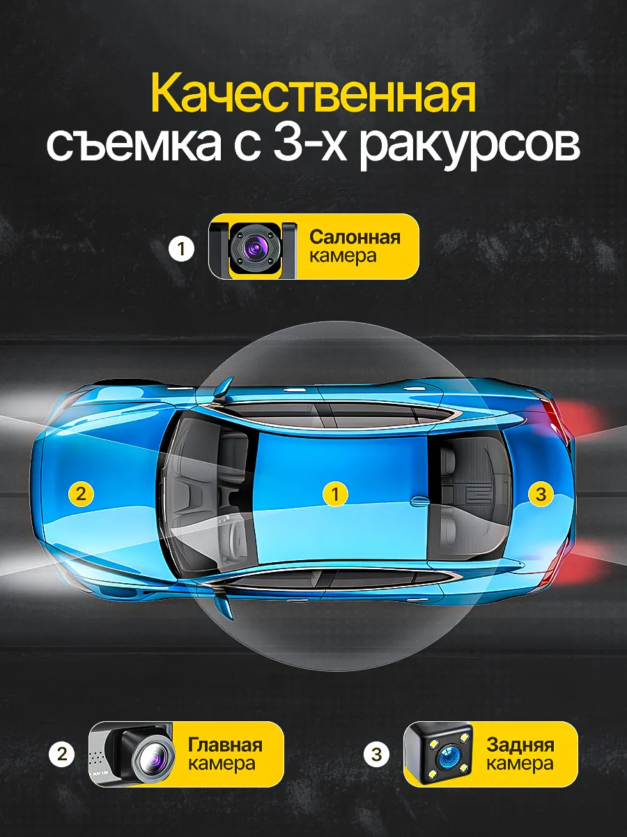Этот инновационный видеорегистратор сочетает три камеры для полного контроля на дороге. Основная камера Full HD обеспечивает кристально чёткую запись происходящего перед автомобилем. Вторая камера фиксирует салон, а третья (заднего вида) делает парковку безопасной и удобной. Устройство автоматически сохраняет важные моменты и поддерживает WiFi для быстрого доступа к записям со смартфона. Работает в любых погодных условиях, защищая вас в спорных ситуациях на дороге.